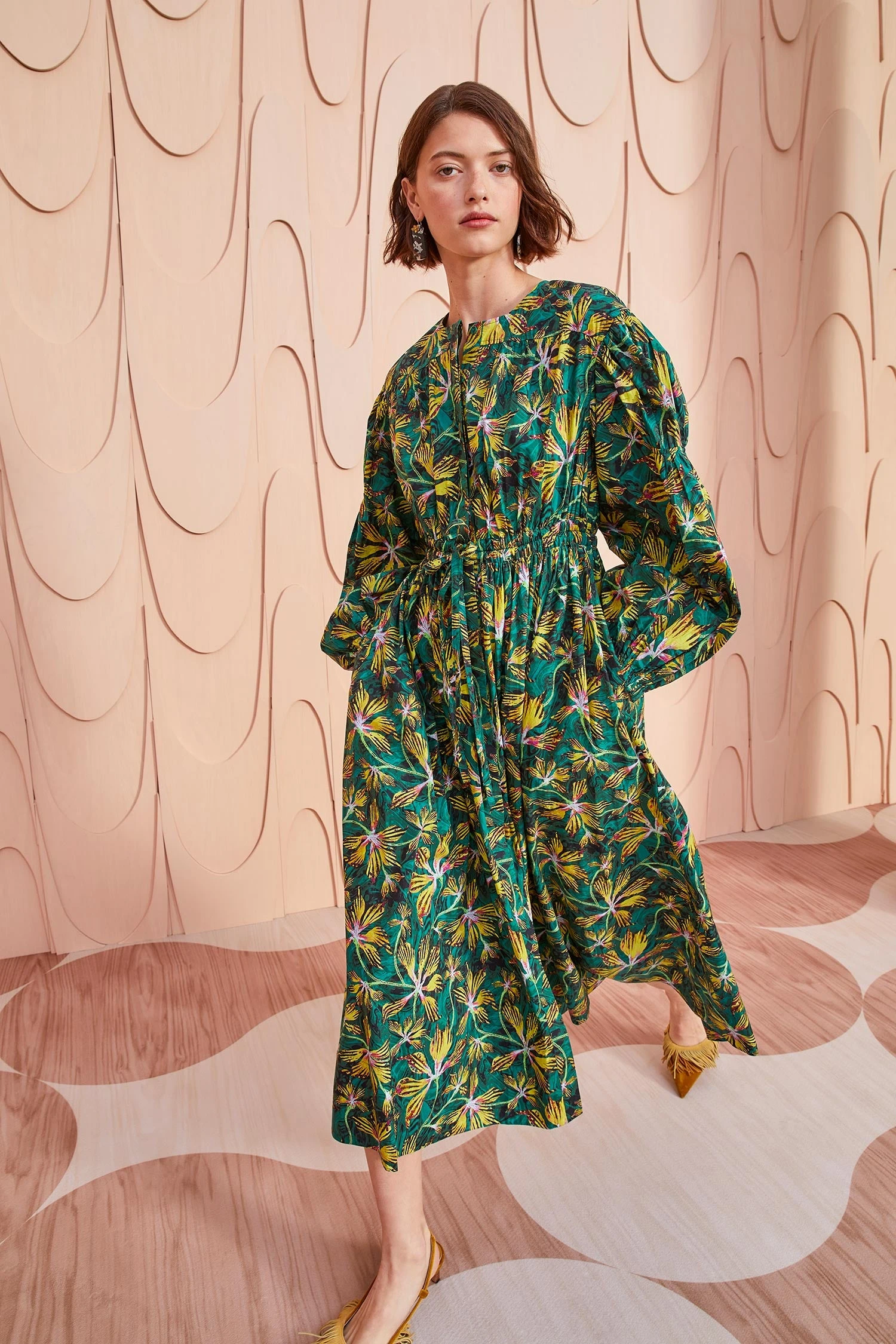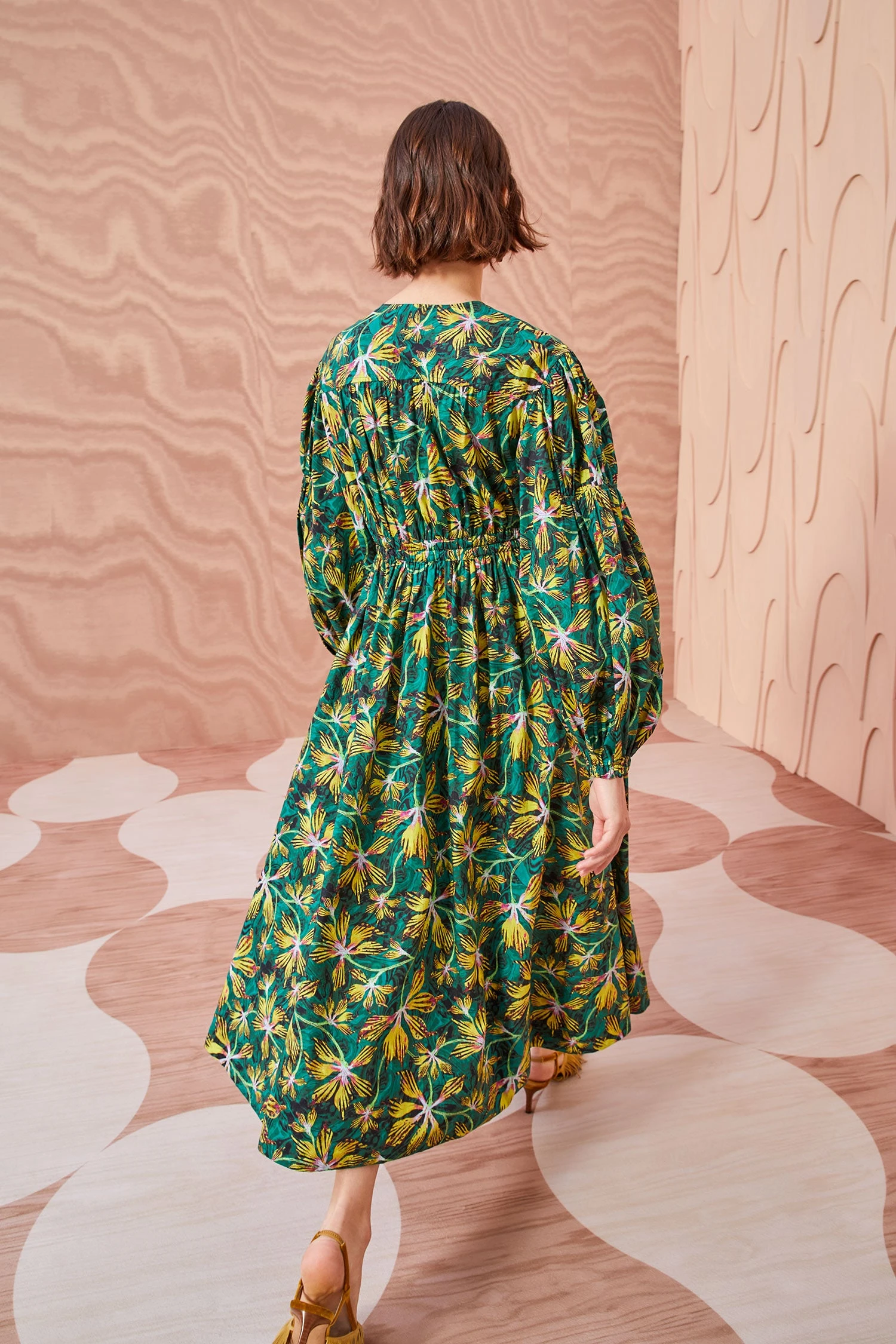 The Adalie Dress is made from crisp cotton poplin that’s beautifully saturated with our moonflower print in notes of emerald green and yellow. This vibrant midi dress boasts long billowing sleeves, side slit pockets, and drawstring waist ties you can adjust for a cinched look. It is finished with a concealed button-front closure.
