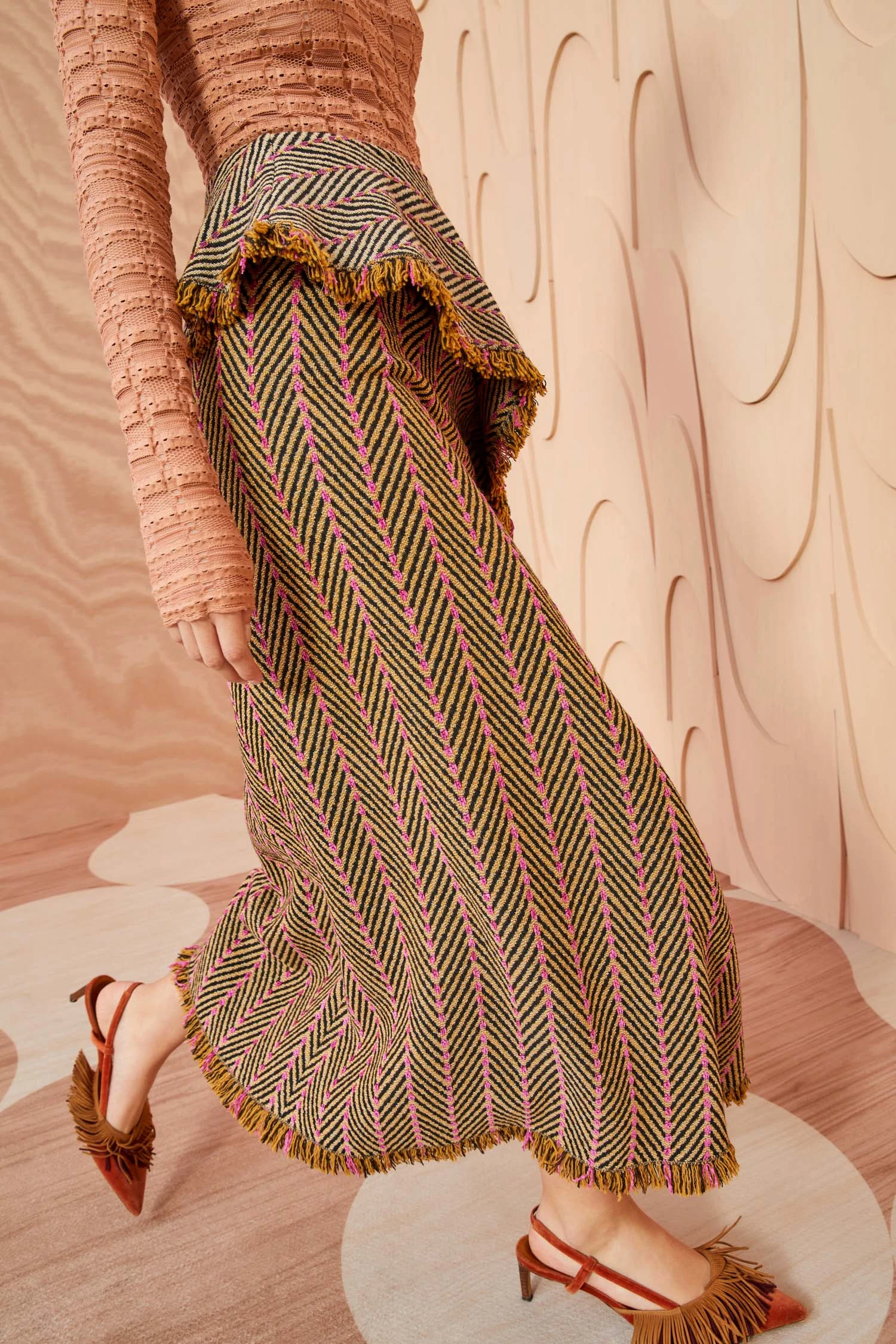 As featured in Look 25 of our Autumn/Winter ’23 Runway Show, the Agatha Skirt is made from our Italian herringbone tweed fabrication. This elevated silhouette features artful draping that unfurls into cascading ruffles and contrast chenille stitching. It is finished with fringe trims and a side-seam zipper closure.