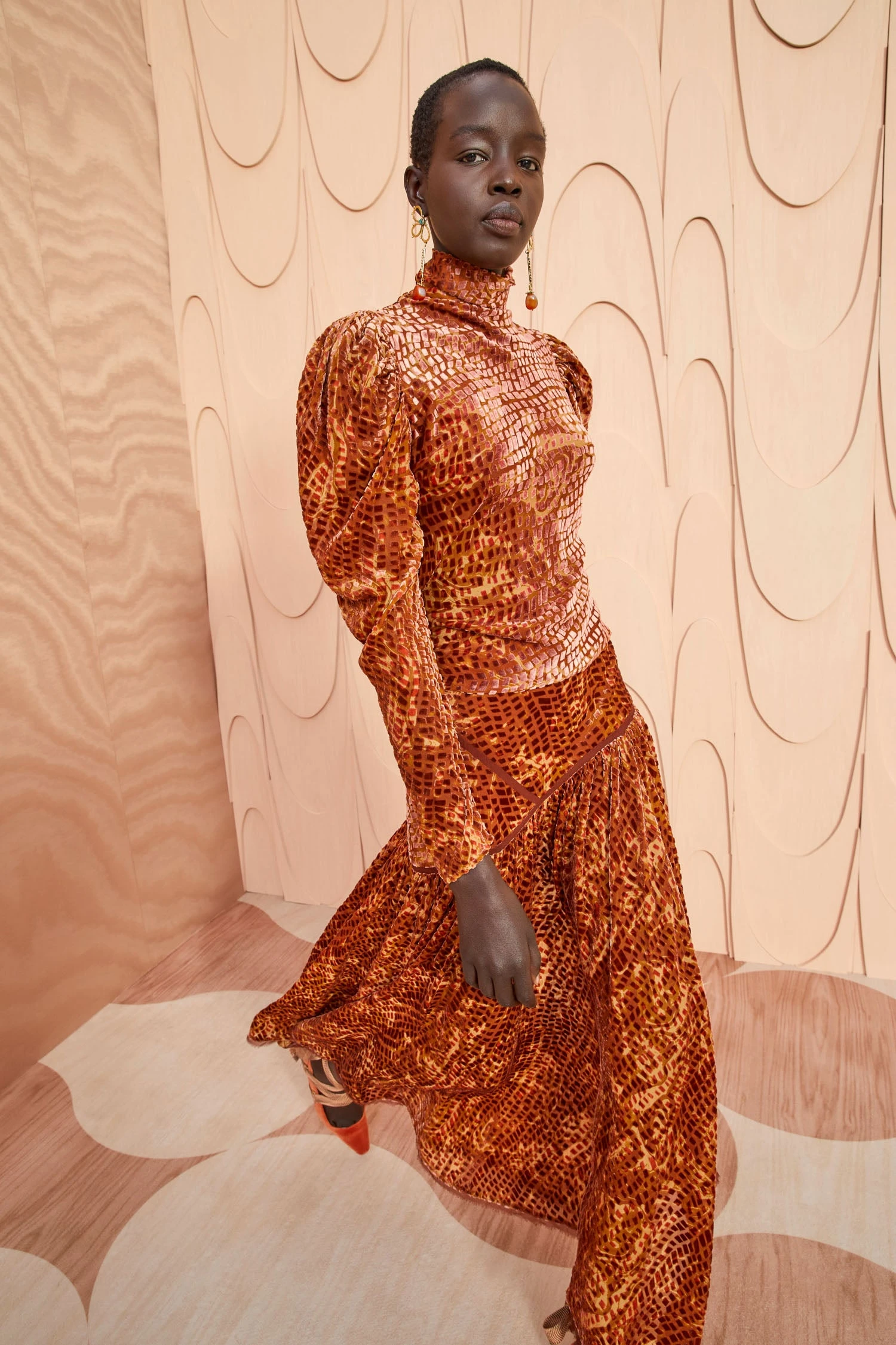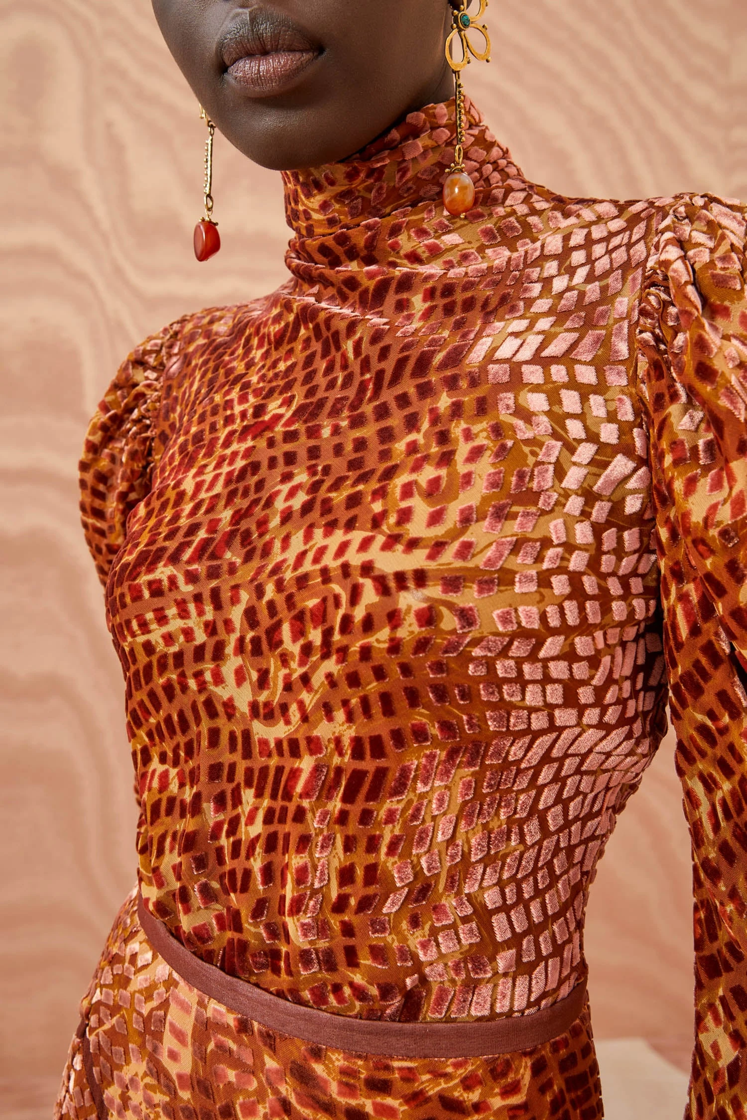The Althea Turtleneck is crafted from our sumptuous velvet burnout fabrication featuring a swirling moiré motif. Framed by our signature puff sleeves, this sienna brown top features an elegant high neck and fastens with a hidden center-back zipper.
