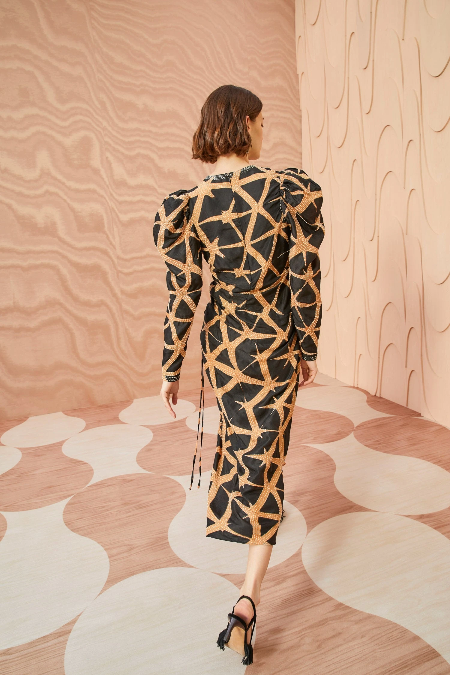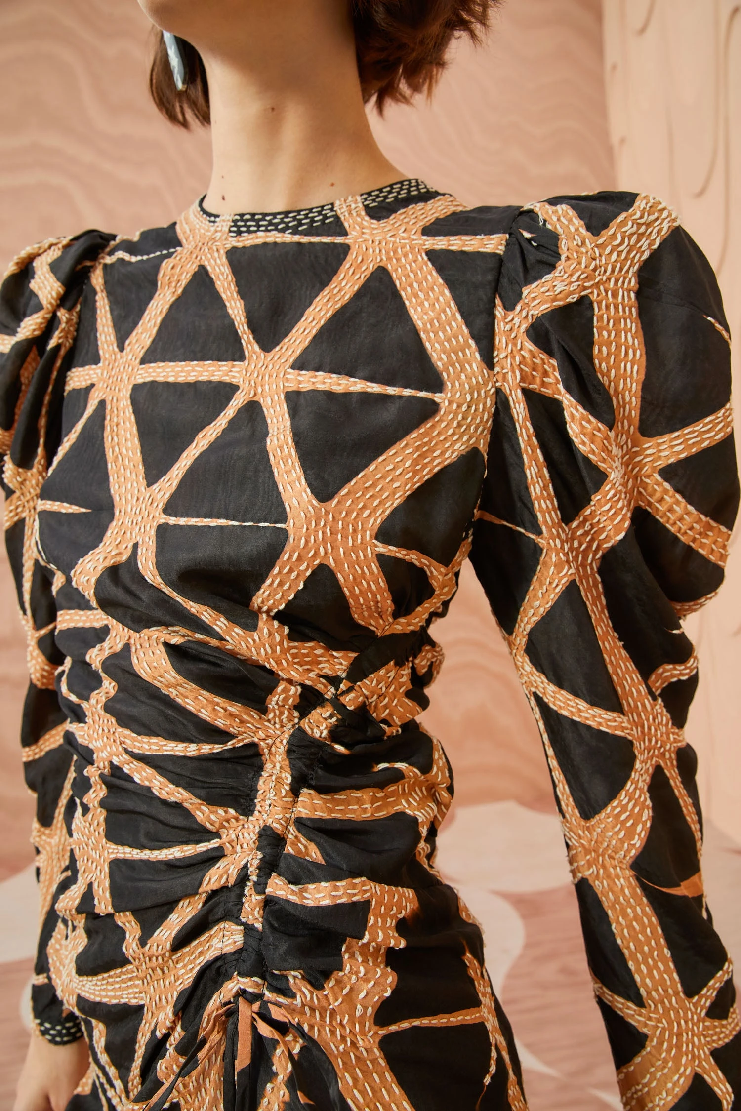As featured on Ulla during our Autumn/Winter ’23 Runway Show, the Amalie Dress is made in our hand-dyed, hand-embroidered silk which is a continuation with artisans from Bangalore, India. This entirely hand-made process of dyeing is accented by hand embroidery in contrast stitching to create additional pattern and texture. This dress features full, draped sleeves and an asymmetric ruched seam down the front to create a body-skimming silhouette. It is finished with a side-seam zipper closure.