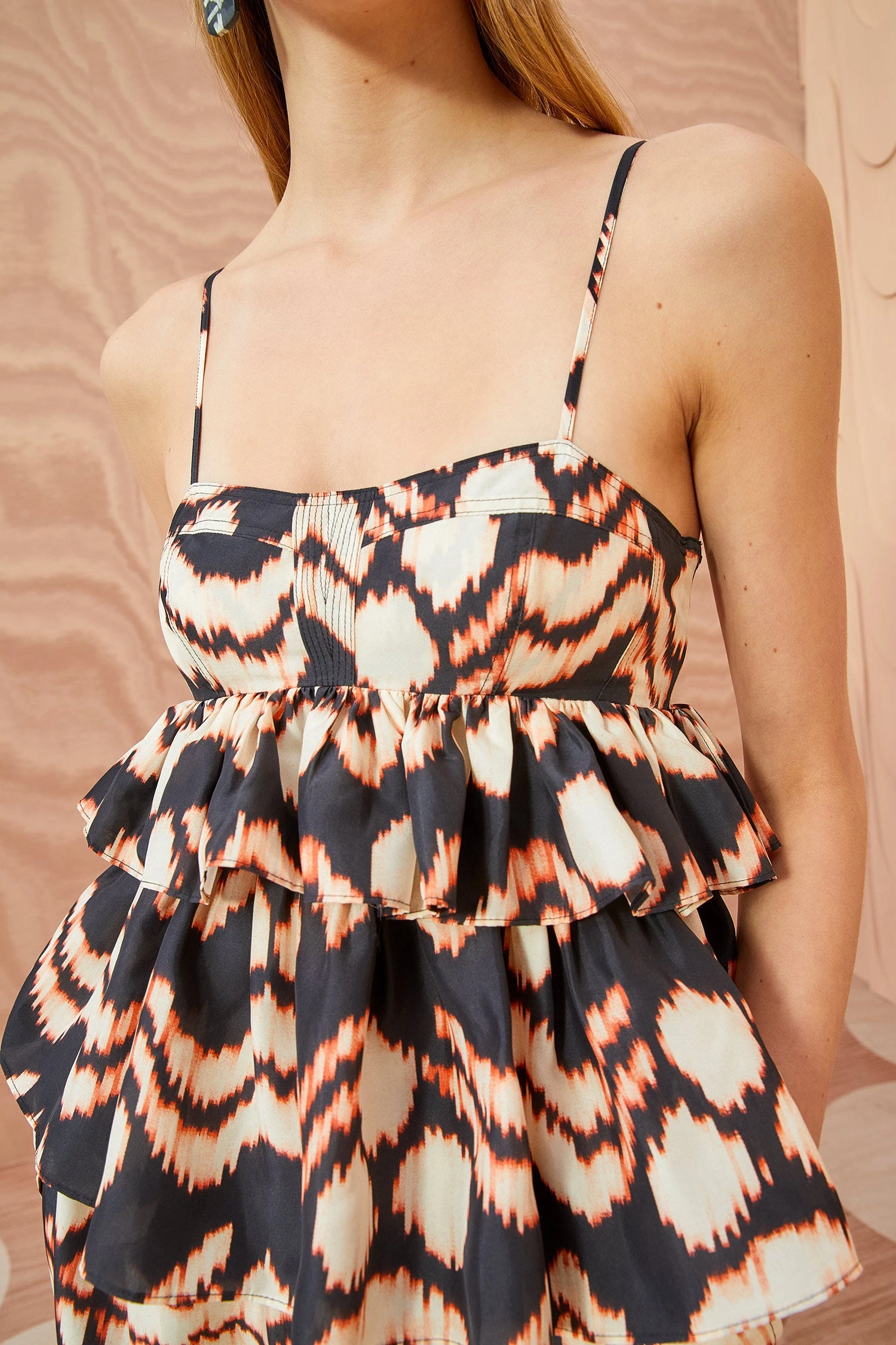Our Amrita Top is made from taffeta that’s richly adorned with our painted ikat motif featuring graphic black and cream hues. This sleeveless top features spaghetti straps, an empire waist, and ruffles that create beautiful volume. It is finished with delicate ties that fasten at the back.