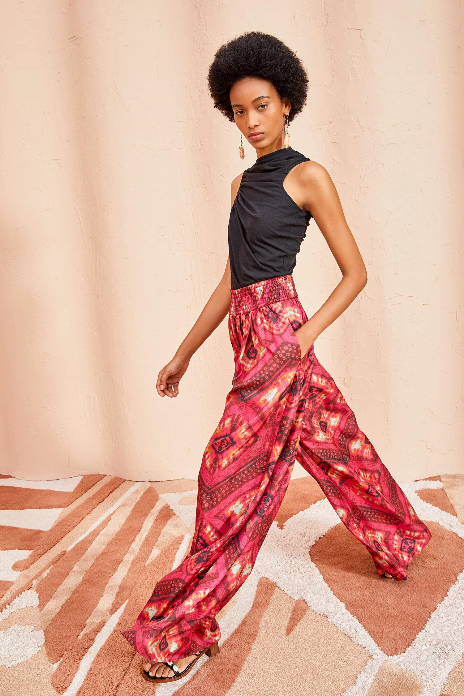 The Clemence Pants, as seen in Look 11 of our Pre-Fall ’23 Lookbook, are crafted from our signature diamond shibori printed silk twill in a stunning shade of dark pink. These wide-leg pants feature a flowy silhouette, a comfortable elastic waistband, and are finished with pockets.
