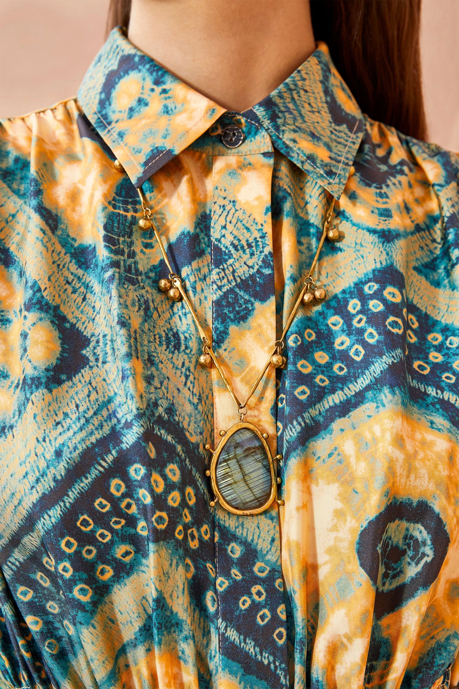 The Hammered Textured Organic Stone Necklace is handcrafted in Kenya by our longtime artisan partners using recycled brass and an exquisite labradorite gemstone pendant. Inspired by organic shapes found in nature, this necklace is detailed with round bobbles along the chain and finished with an adjustable S-clasp closure.