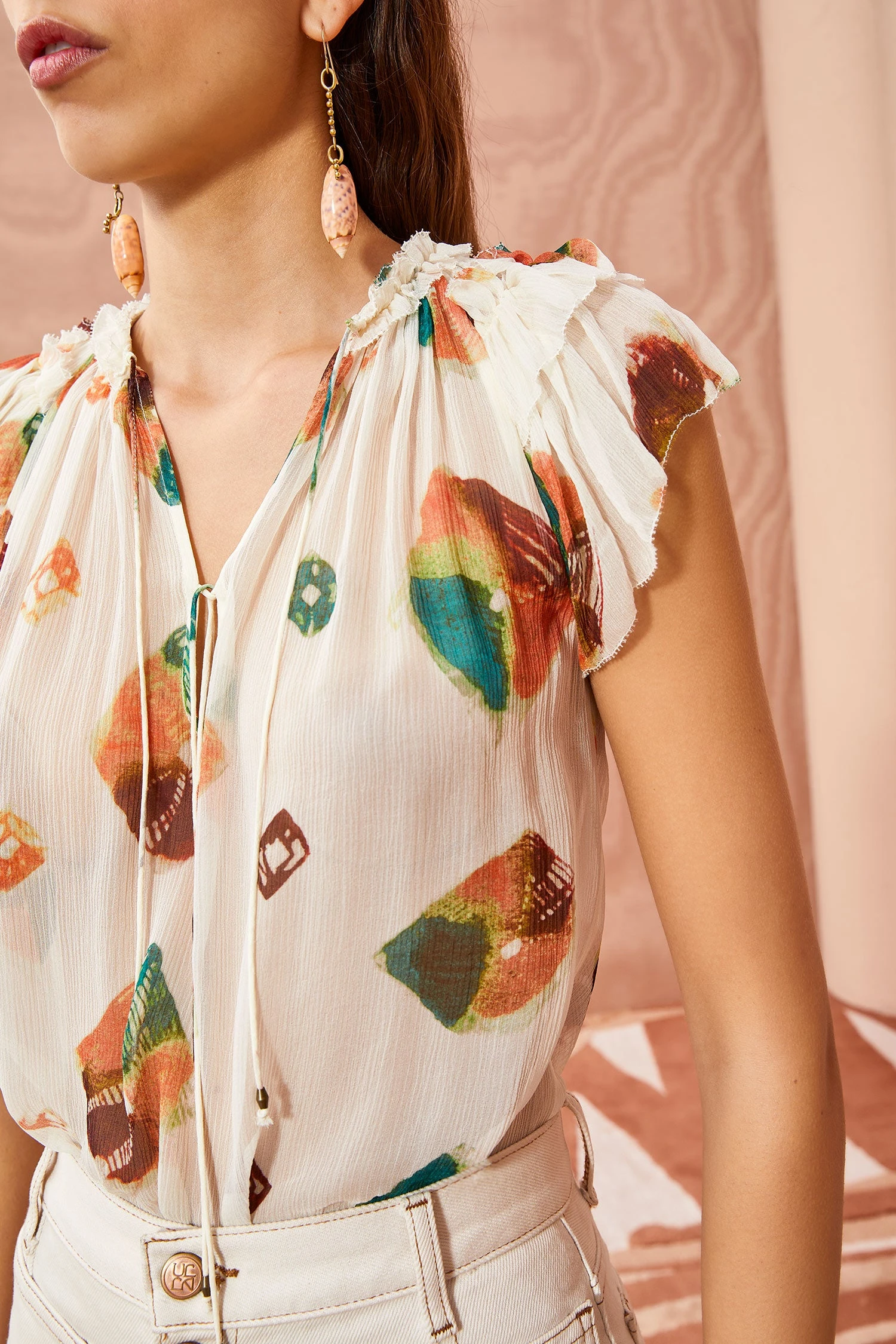 The Marilyn Top is a pull-over style blouse crafted from our floating shibori printed crinkle chiffon in a cream hue, featuring delicate, multicolored graphic geometries. This romantic blouse has short flutter sleeves, ruffle details along the neck, and a split neckline with two neckties in the front.