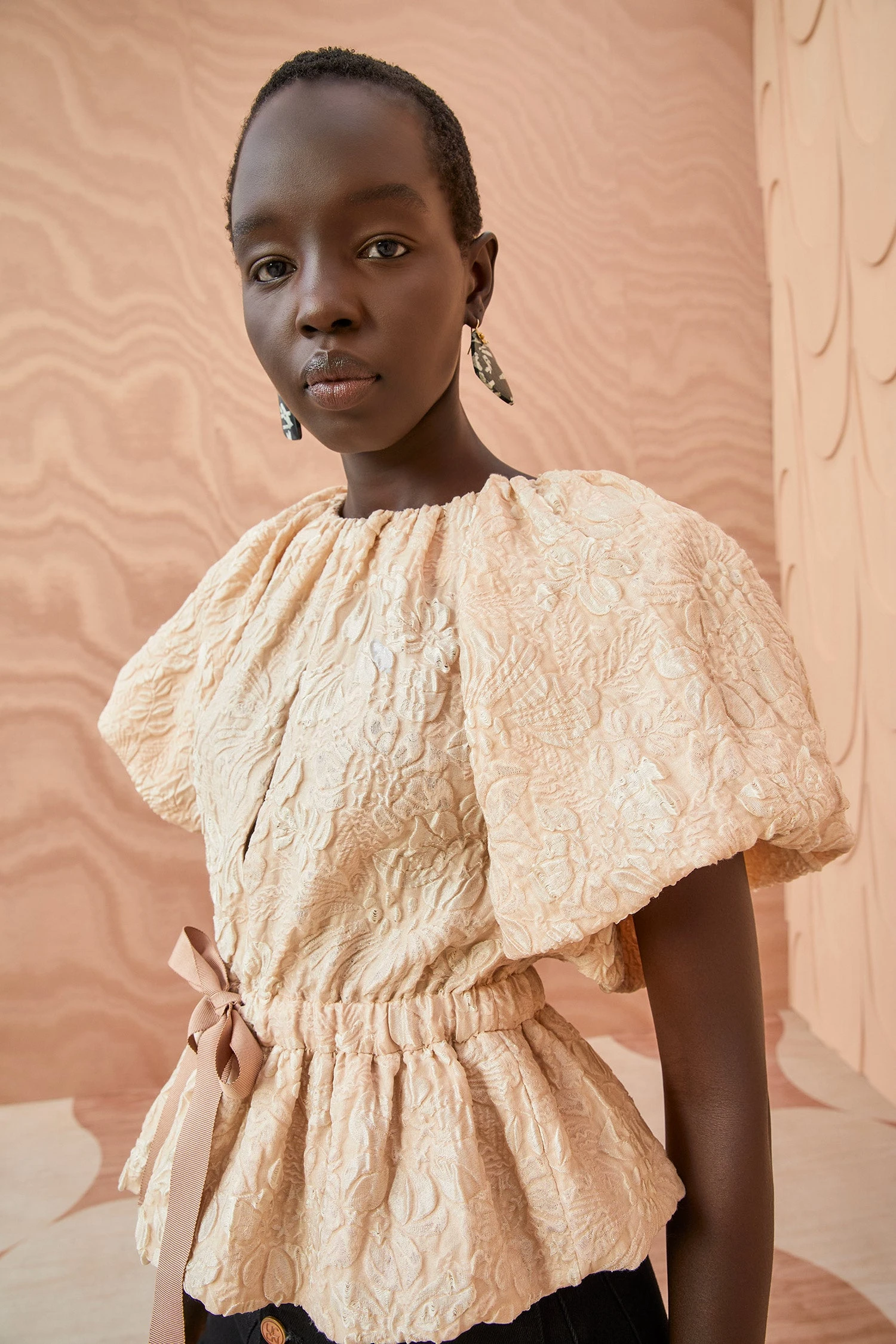 The Mirabelle Top is made from our standout cloqué jacquard with a gorgeous moon flower motif. This soft pink top features statement puff short sleeves, a concealed button closure with a playful keyhole, and a grosgrain waist ribbon that creates a lovely peplum hem.
