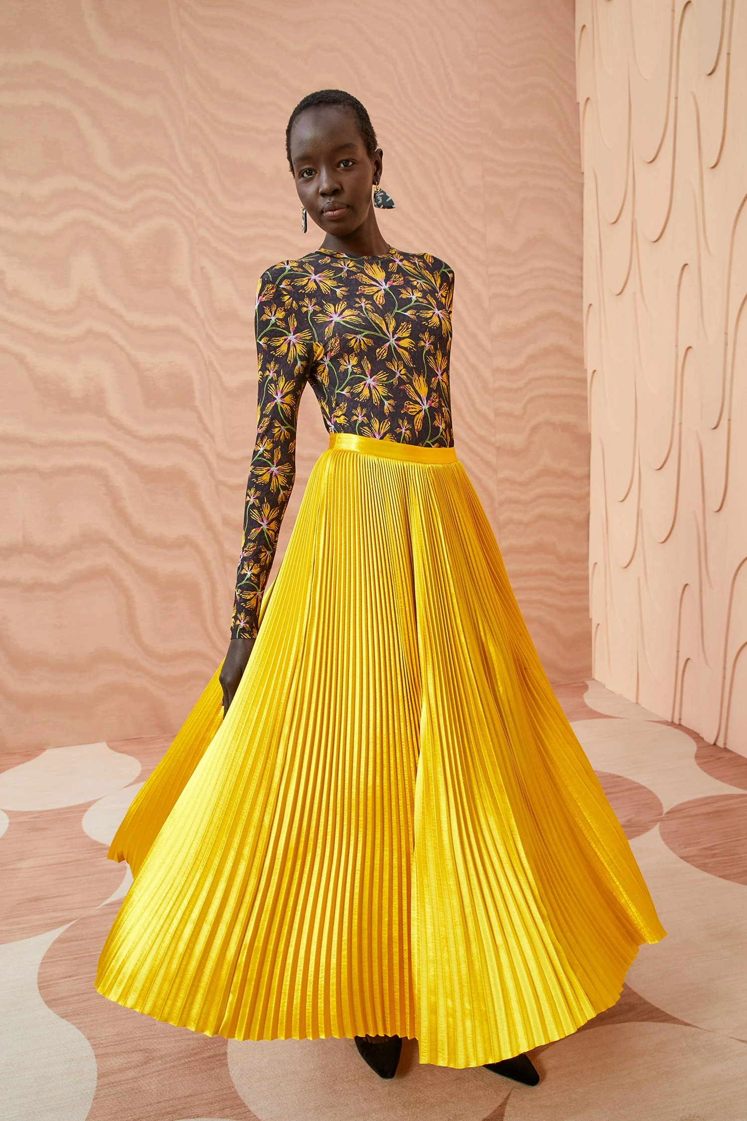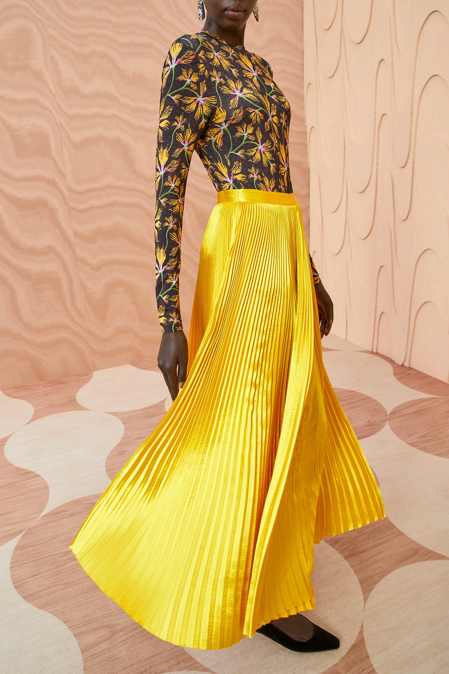 As featured in Look 30 of our Autumn/Winter ’23 Runway Show, the Rami Skirt is made from pleated satin in a saturated hue of sunsprite yellow. This lustrous skirt expands and contracts with movement, and has a fixed waist and a midi-length hem.