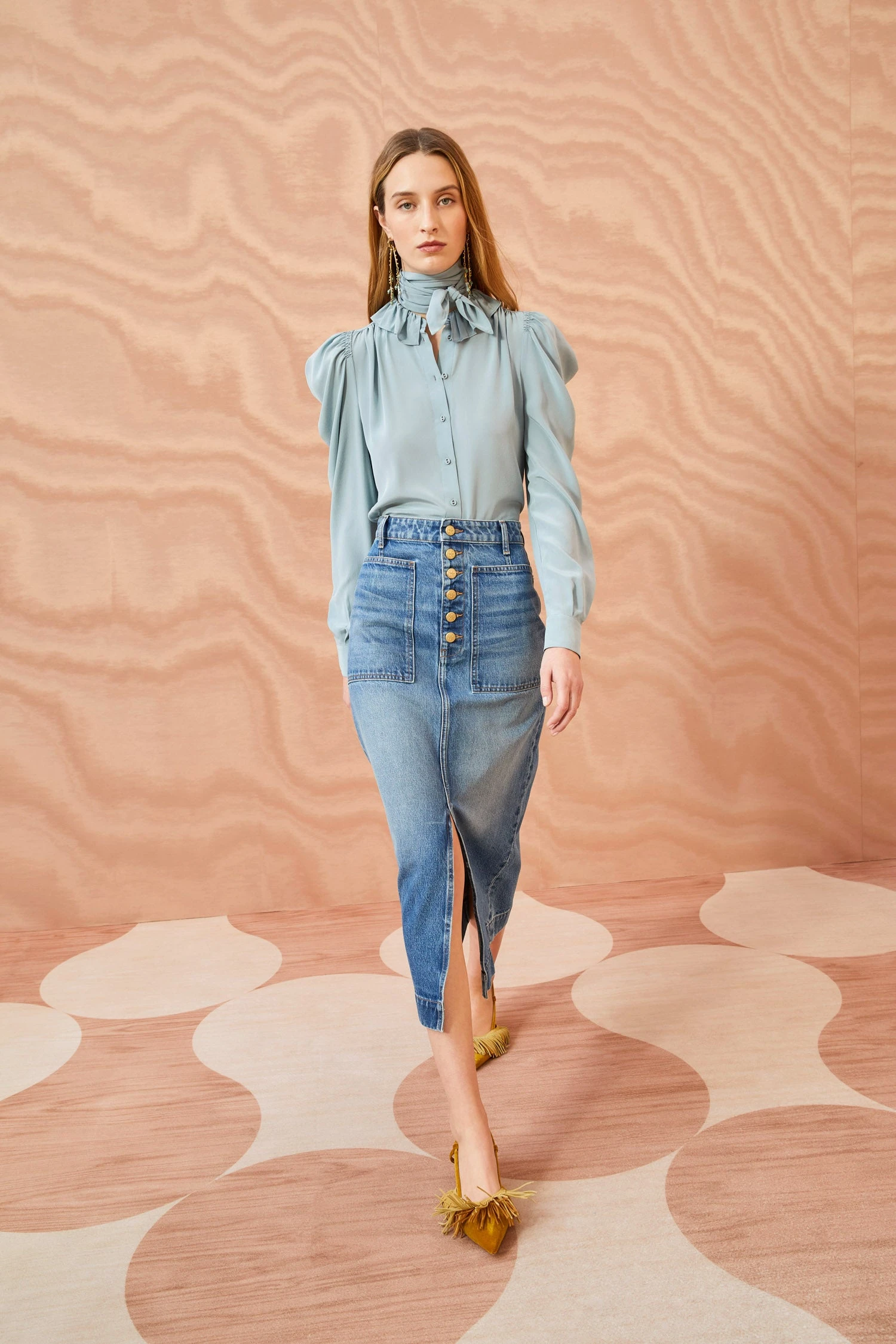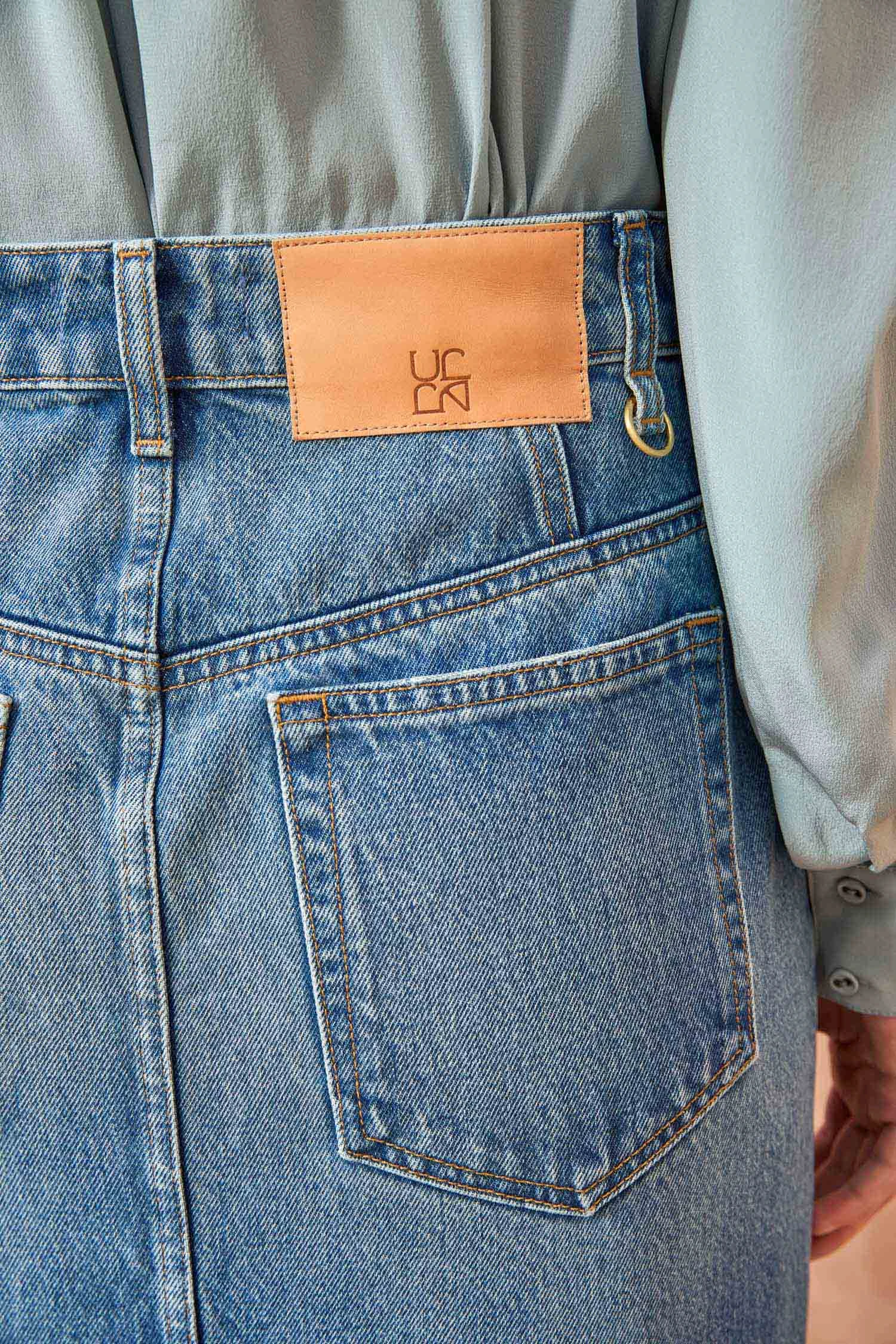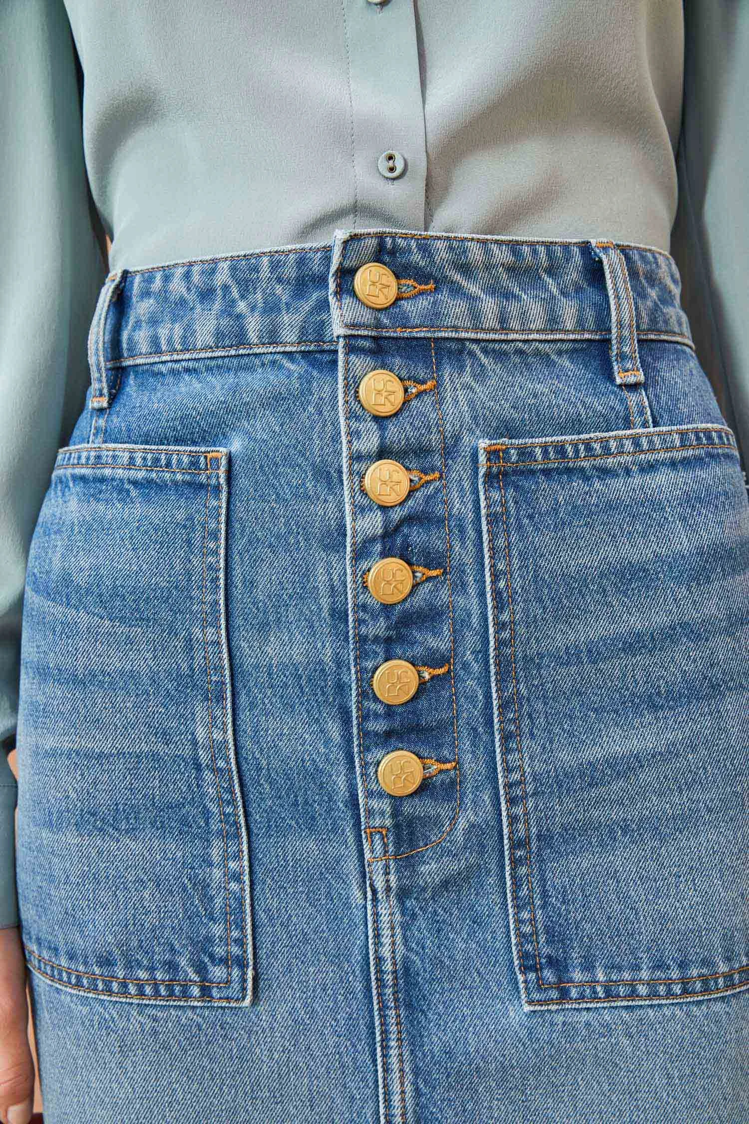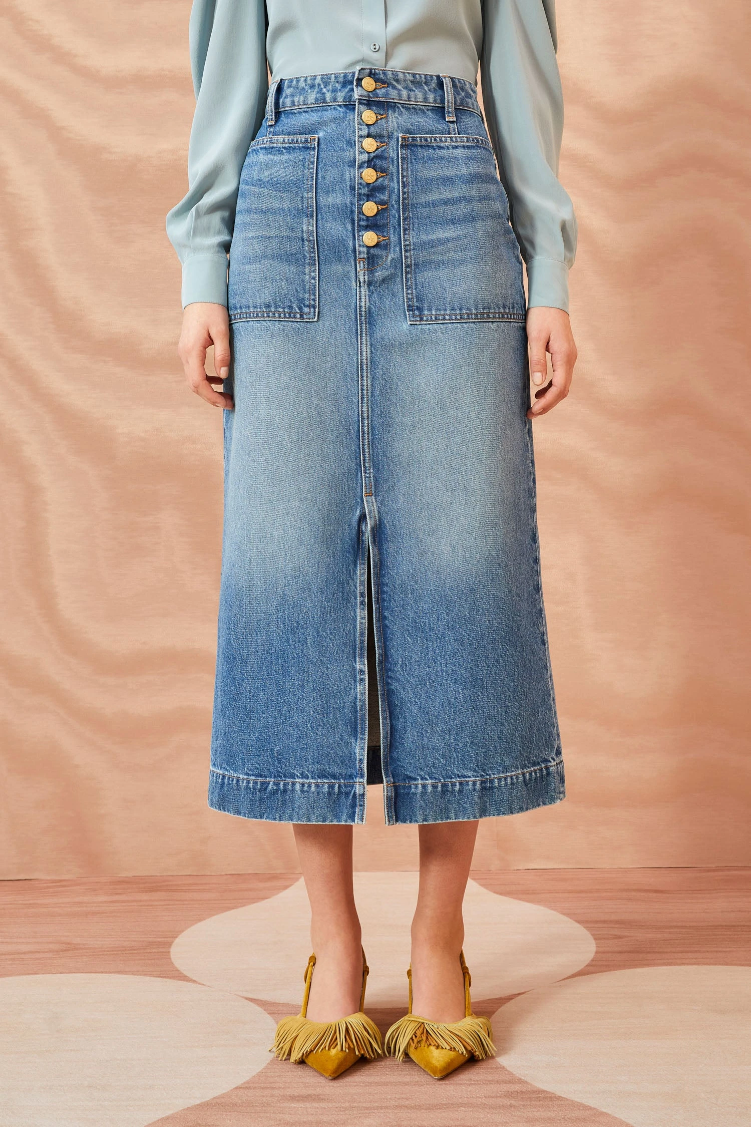 A new silhouette from our Autumn/Winter ’23 collection, the Bea Skirt is responsibly handcrafted in Los Angeles from non-stretch denim in our classic Danube Medium Indigo wash. Designed to sit high on the waist, this midi skirt features patch pockets and exposed front buttons that gleam. The front split provides ease of movement.