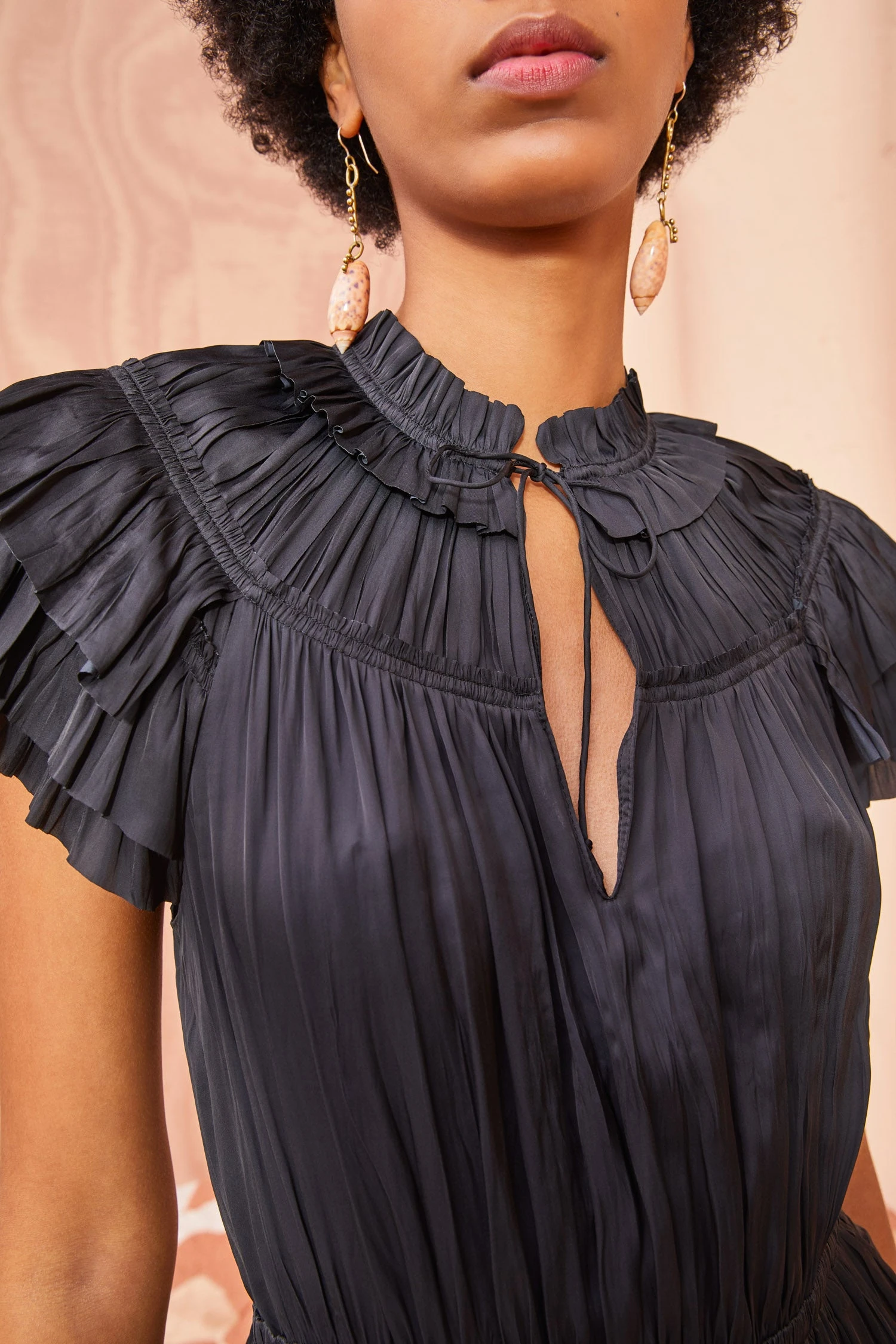 The Vesna Dress is a short-sleeved black mini dress crafted from our signature crushed plissé satin. This perfect party dress is defined by ruffled layers that adorn the sleeves and skirt, which is mirrored by a gorgeous ruffle detail at the neck that is completed with a delicate tie. Finished with a side-seam zipper.