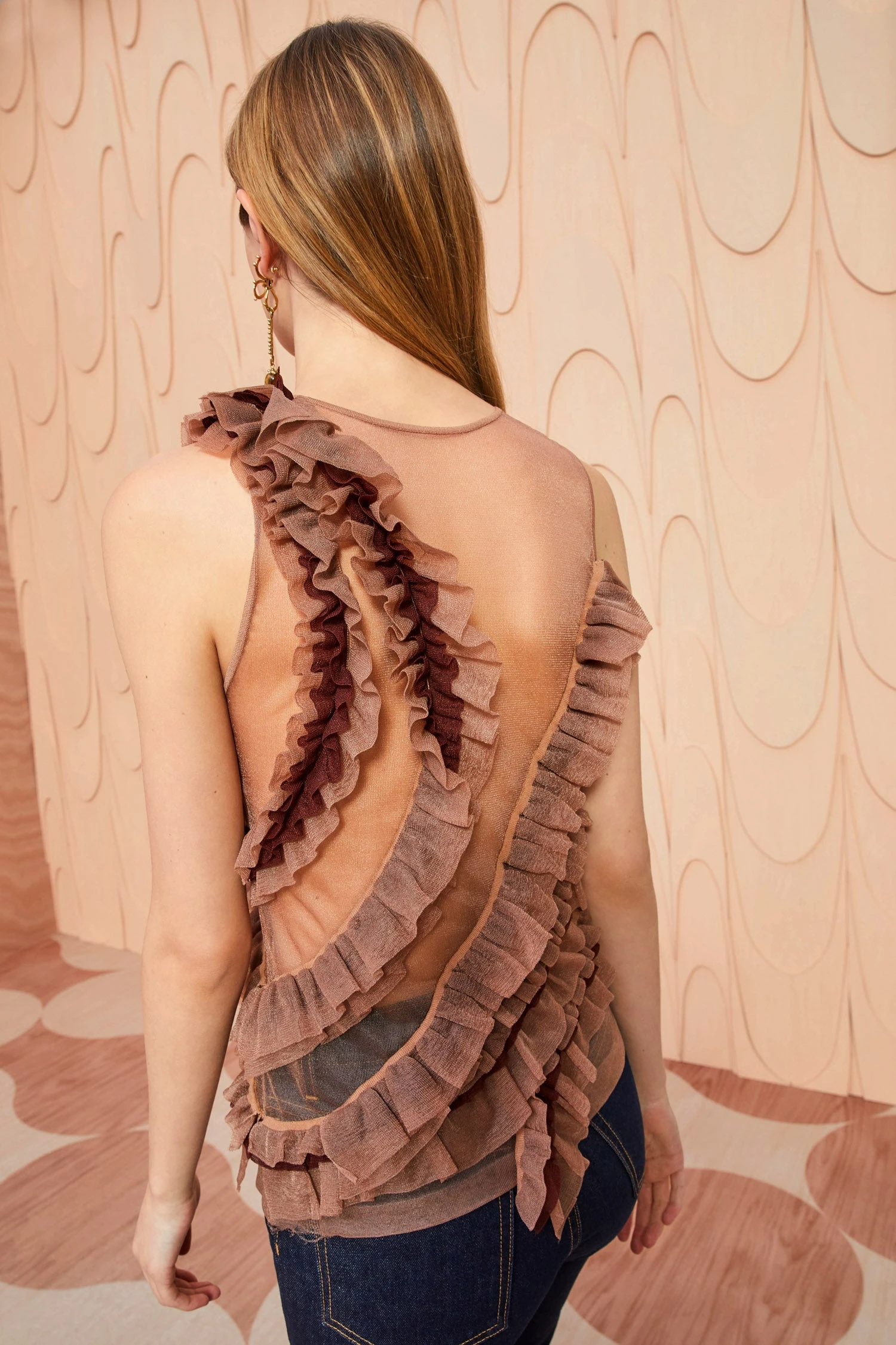 As featured in Look 49 of our Autumn/Winter ’23 Runway Show, the Winnifred Top is made from our translucent frills knit, a sheer light brown top adorned with a strategically placed explosion of fluttering frills across the bodice. Pair this sleeveless top with the Sarafina Skirt for the full look.
